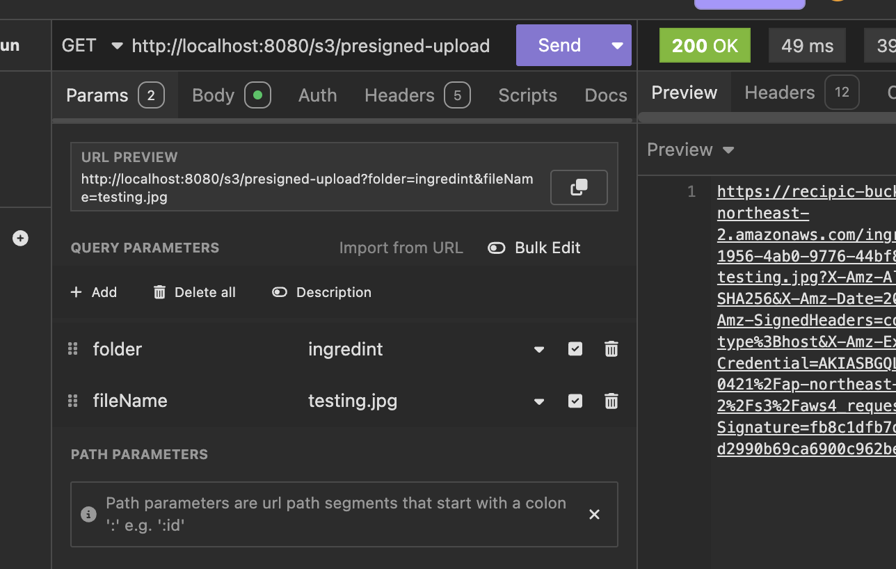 - 요청 url을 아까 받은 presignedURL로 저장하고 싶은 이미지를 put 요청을 하면 200응답을 확인할 수 있다.